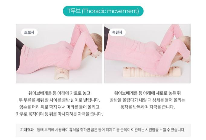 웨이브베개를 이용하여 할 수 있는 대표 동작으로는 C무브, T무브, L무브 동작 등이 있고 각각 경직된 목, 등, 허리를 풀어주는 동작이에요.
