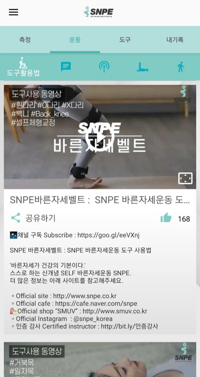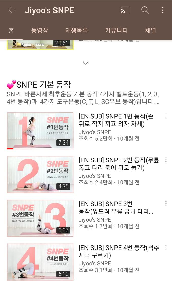 그리고 운동 카테고리로 들어가게 되면 공식 유튜브 페이지와 연결되어 있어, 유튜브 어플을 따로 켜서 검색하지 않아도 기본동작부터 SNPE 운동법까지 영상으로 바로 확인할 수 있습니다.